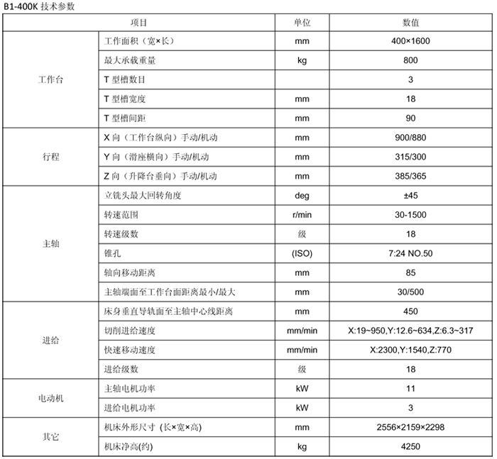 B1-400K 立式升降臺銑床是我廠原X53k基礎(chǔ)上的改型產(chǎn)品。X53k曾榮獲機械工業(yè)部頒發(fā)的 “質(zhì)量信得過產(chǎn)品”稱號。該產(chǎn)品結(jié)構(gòu)可靠、性能好、質(zhì)量穩(wěn)定、操作方便,適用于各類機械加工,可加工各種平面、溝槽、齒輪等。配置圓工作臺、分度頭等銑床附件,可進一步擴大機床的使用范圍。